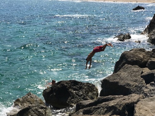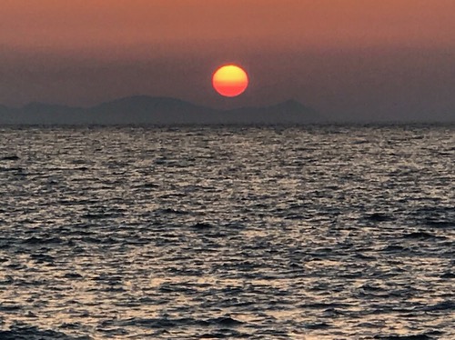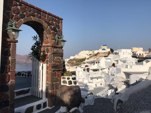 Above:  We walked down to a Amoudi beach/port to watch the sunset. Our hotel is at the top of the stairs you can see transversing the cliffs. 350 steps. For exercise this morning I ran/walked up them, mostly walked…and over a lot of donkey poop. Apparently you can hire a donkey to carry you up.