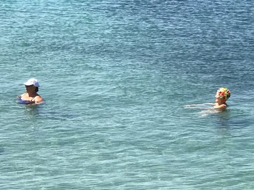 Below:  we purchased two swim caps, worn by the lady on the right of the photo, for Memaw and Grammy. It can be used for swimming, showering, boat riding or running to the resort for Gooey’s. It’s all the rage here. I think Kurt has one!