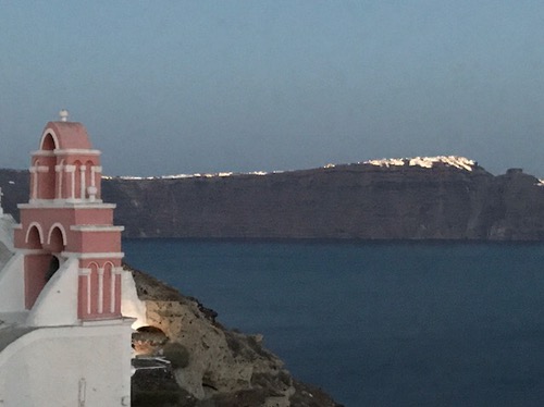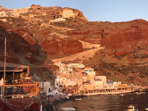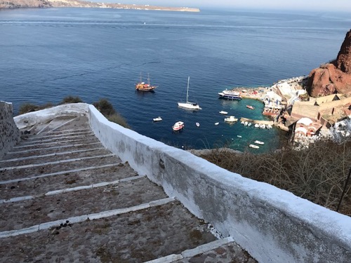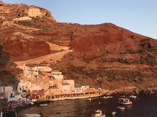 Above:  We walked down to a Amoudi beach/port to watch the sunset. Our hotel is at the top of the stairs you can see transversing the cliffs. 350 steps. For exercise this morning I ran/walked up them, mostly walked…and over a lot of donkey poop. Apparently you can hire a donkey to carry you up.
