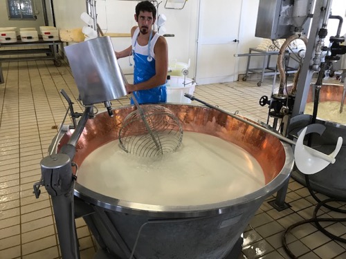 That one Copper vat holds 300 gallons of cows milk, whey and renit.        It takes 150 gallons per cheese wheel.           40 cows milk per cheese wheel                  Cost to a restaurant to purchase 500€ ($600) per cheese wheel. (640€ organic cheese wheel) This small company makes 20-25 wheels per day         Copper Vats cost 12,000€ each.        90lbs per wheel.