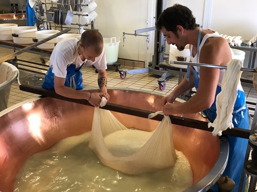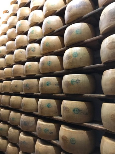 We visited the Latteria Sociale Nuova, a family run, Parmigiano Reggiano cheese producing company. It was a long process I won’t go into but the minute clip below shows the son and a worker bringing up the Parmesan ball from the bottom of the vat. That one Parmesan ball in the video makes two Parmesan cheese wheels.  The Parmesan wheels age in their store house for three years before they sell them.