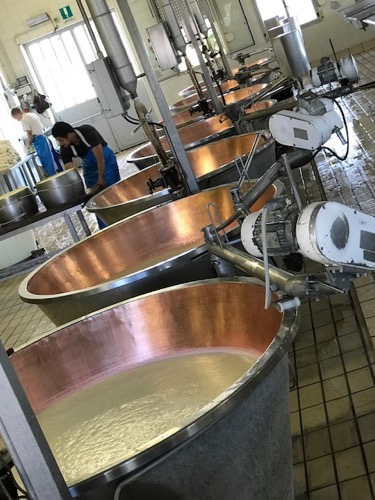 That one Copper vat holds 300 gallons of cows milk, whey and renit.        It takes 150 gallons per cheese wheel.           40 cows milk per cheese wheel                  Cost to a restaurant to purchase 500€ ($600) per cheese wheel. (640€ organic cheese wheel) This small company makes 20-25 wheels per day         Copper Vats cost 12,000€ each.        90lbs per wheel.