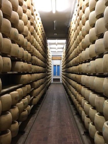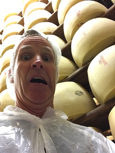 We visited the Latteria Sociale Nuova, a family run, Parmigiano Reggiano cheese producing company. It was a long process I won’t go into but the minute clip below shows the son and a worker bringing up the Parmesan ball from the bottom of the vat. That one Parmesan ball in the video makes two Parmesan cheese wheels.  The Parmesan wheels age in their store house for three years before they sell them.
