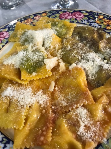 Visited a family run prociutto company. Crazy pig legs everywhere. Hanging for three years before they sell. Had lunch at La Lanterna and was served four different kinds of ravioli. Pumpkin, potato, spinach and mushroom.